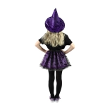 Lichte, puntige hoed in paars-zwarte combinatie maakt de outfit stijlvol af en versterkt de magische sfeer.