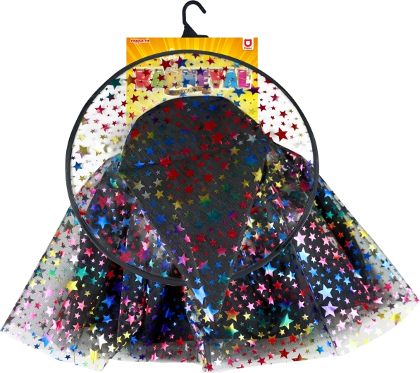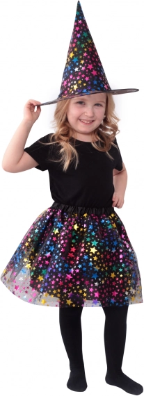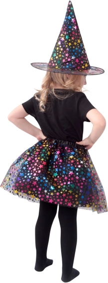 Dit schattige heksenkostuum voor kinderen in het zwart is versierd met een kleurrijk sterrenpatroon dat meteen opvalt. De set bevat een luchtige tuturok met een lengte van ca. 30 cm en een bijpassende spitse hoed, waarmee elk kind in een mum van tijd in een kleine heks verandert.