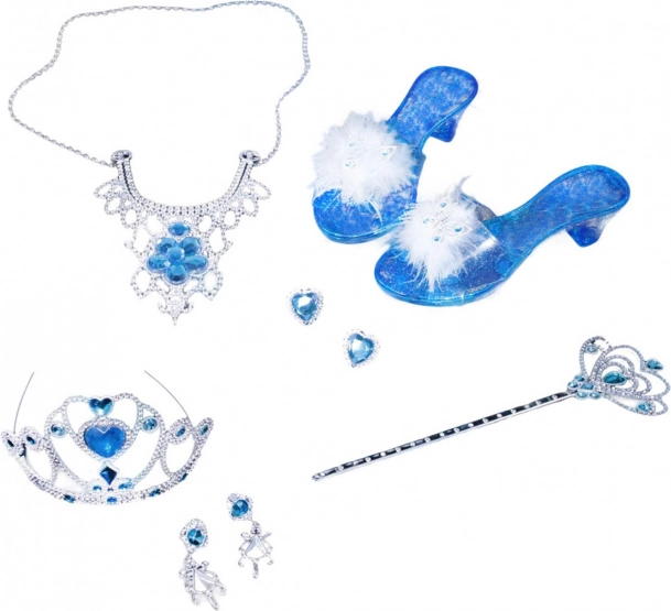 Word een winterprinses met deze prachtige accessoireset, die luxe schoentjes, een mooie kroon, een scepter, een betoverende ketting met oorbellen en een ring bevat.