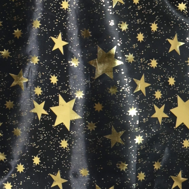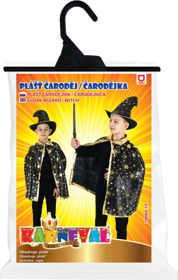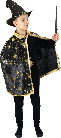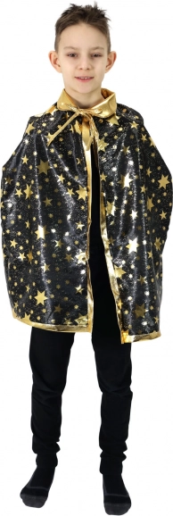 Prachtige heksen-/tovenaarsmantel! Dit magische stuk is bedoeld voor alle meisjes en jongens van 3–10 jaar (104–150 cm). De striksluitingmantel is versierd met gouden sterretjes en een gouden bies. Lengte van de mantel ca. 75 cm.