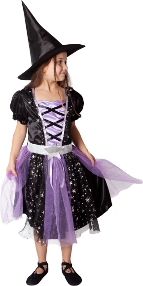 Dit charmante heksenkostuum zal alle kleine liefhebsters van magie verrukken. Het combineert elegant zwart met betoverend paars, glinsterende sterren en lichte tule voor een echt magische look. De puntige hoed matcht met de jurk en maakt de outfit compleet voor carnaval, Halloween of schoolfeestjes.