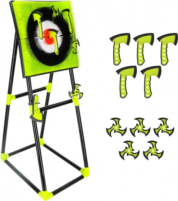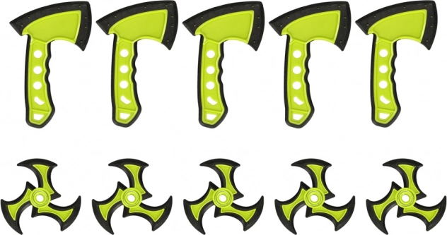 Leuke en veilige set voor het werpen op een doelwit met zachte siliconen bijlen en shuriken op een stabiele standaard. Ideaal voor kinderen vanaf 8 jaar – ontwikkelt fijne motoriek, oog-handcoördinatie en nauwkeurigheid. Zachte siliconen uiteinden en licht kunststof zorgen voor veilig spel, zowel binnen als in de tuin.