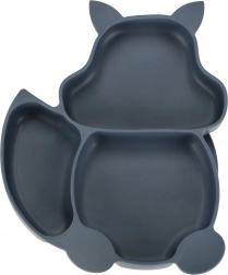 Complete 9-delige siliconen eetset voor kinderen met eekhoornmotief in donkerblauw. Bevat een verdeelbord, een kom met zuignap, een beker met twee deksels en een rietje, een slab en zacht bestek. BPA-vrij, stevig en eenvoudig te reinigen in de vaatwasser – ideaal voor de eerste zelfstandige eetmomenten met antislip-zuignappen.