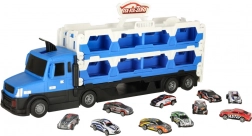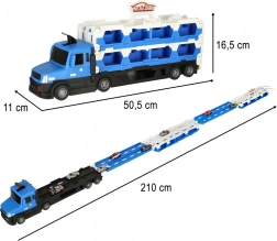 De vrachtwagen biedt dubbel zoveel plezier: als autotransporter brengt hij de autootjes naar de race en met één beweging verandert hij in een racebaan van 210 cm. De geïntegreerde lanceerder schiet de auto’s bliksemsnel de baan op, terwijl licht- en geluidseffecten de races een realistische sfeer geven. Het duurzame kunststof ontwerp is ideaal voor dagelijks spelen.