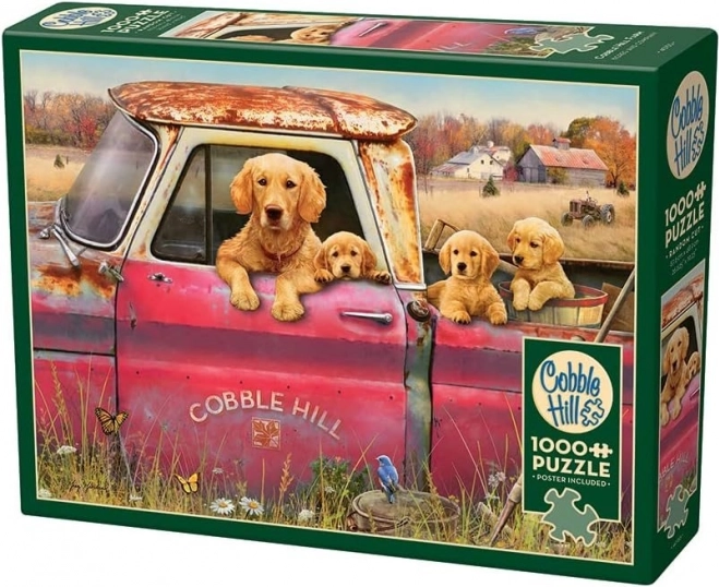 De gedetailleerde illustratie van een rustieke truck, bloemen en vier schattige retrievers brengt een warme huiselijke sfeer en plezier tijdens het puzzelen.