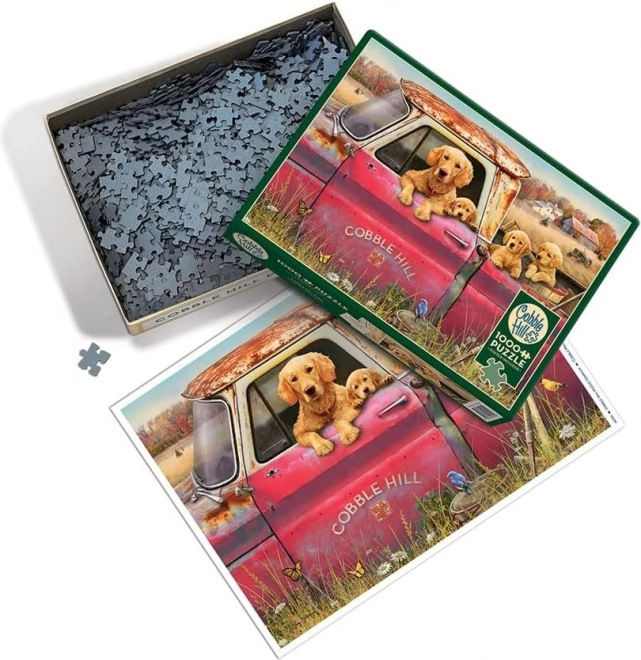 Ervaar de betoverende dorpssfeer met een gedetailleerde illustratie: een roestige rode truck, velden, bloemen, vlinders en vier speelse puppy’s zorgen voor uren aangename ontspanning. Dankzij de hoogwaardige afwerking en de onregelmatig gevormde stukjes geniet je van soepel puzzelen en een perfect resultaat.
