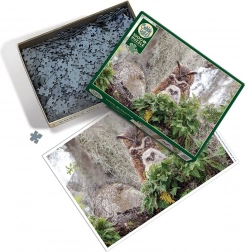 De gedetailleerde weergave van een volwassen oehoe met jong in weelderig groen versterkt de natuursfeer en maakt van de puzzel een aansprekend decoratief kunstwerk.