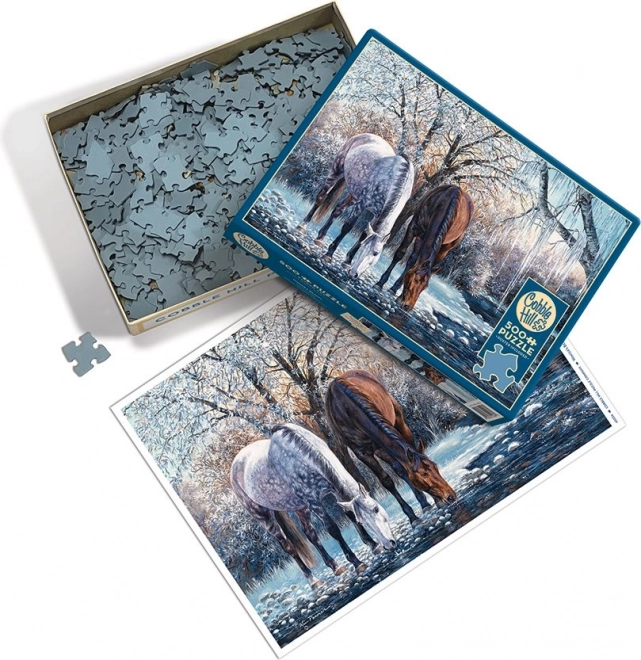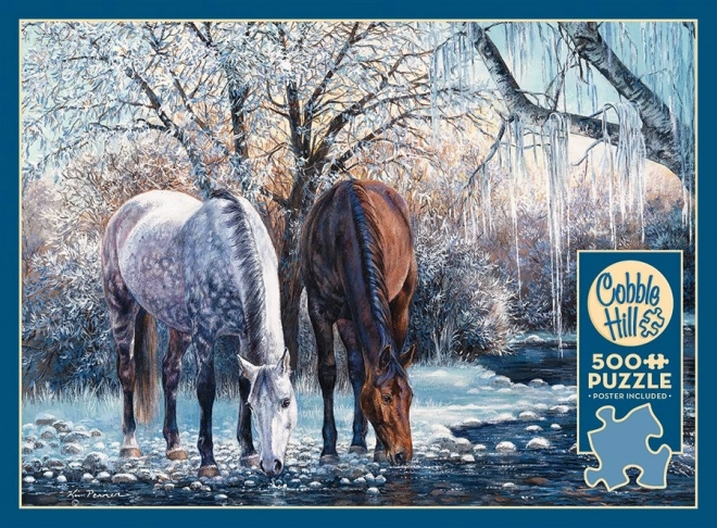 Geniet van de serene wintersfeer met een afbeelding van twee paarden bij een bevroren beek.