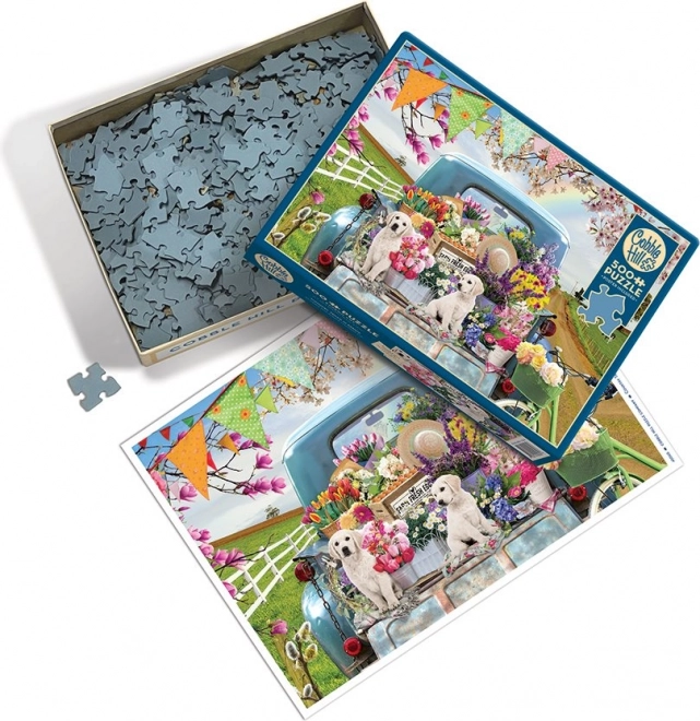 De COBBLE HILL Lente busje puzzel met 500 stukjes is ideaal voor puzzelliefhebbers die op zoek zijn naar meer dan alleen een standaardervaring. Elk stukje heeft een unieke vorm, wat een speelse complexiteit toevoegt aan het leggen. De afbeelding toont een vrolijke landelijke scène met een blauw vintage busje vol met lentebloemen, die een vleugje platteland in huis brengt.