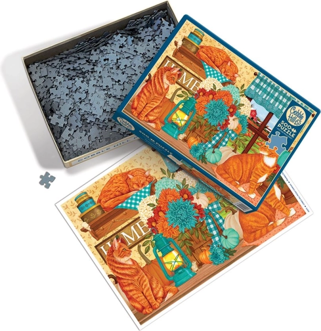 Ervaar ontspannen plezier met de puzzel Katten in Pompoenkleur van COBBLE HILL. Deze puzzel met 500 stukjes brengt herfstsfeer in huis met een betoverend tafereel van drie katten omringd door bloemen en pompoenen.