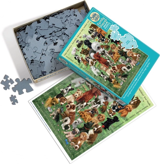 De familiepuzzel met puppy-motief biedt een slimme indeling in grote, middelgrote en kleine stukjes, zodat iedereen van zijn eigen deel kan genieten. Jongere kinderen beginnen met de delen met grote stukken, oudere kinderen en volwassenen met de fijnere details met kleinere stukjes.