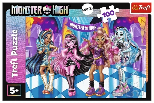 Puzzel 100 stukjes Monster High – spookachtige vrienden. Formaat 41 × 27,5 cm, gekalanderd glanzend papier, milieuvriendelijke materialen, gemaakt in Polen.