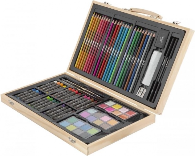 Ontdek je artistieke kant met onze houten kunstkoffer, die alles bevat wat je nodig hebt voor creaties, van kleurpotloden tot oliepastels.