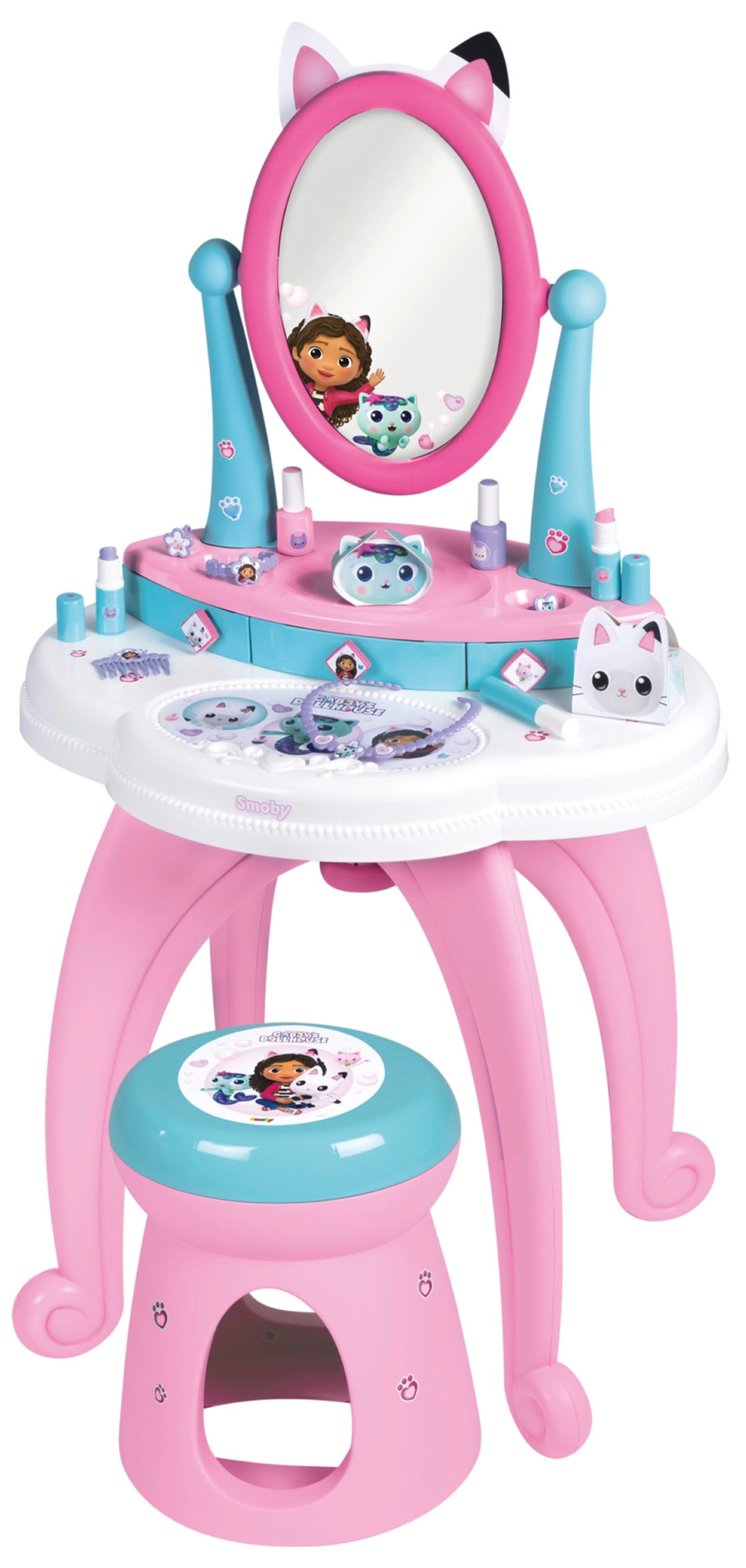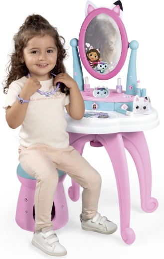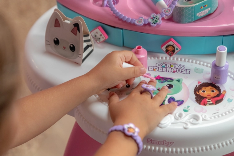 De kinderkaptafel geïnspireerd op de populaire serie GABBY’S DOLLHOUSE tovert de kamer om tot een klein beautysalon. Dankzij de grote verstelbare spiegel, drie lades en de uitgebreide set accessoires is alles binnen handbereik en voelt het spel realistisch en veilig.