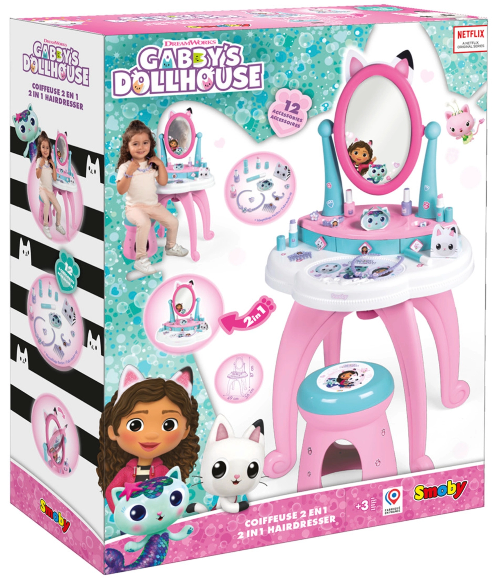 Stap de magische wereld van GABBY’S DOLLHOUSE binnen met de 3-in-1 kinderkaptafel van Smoby. Biedt föhnen, make-up en nagelverzorging, heeft een groot verstelbaar spiegel, 3 lades en een comfortabel krukje. In de set zitten 12 accessoires voor creatief spel en het stimuleren van de verbeelding.