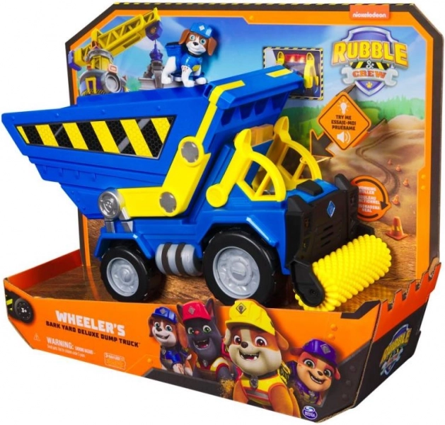 Start de bouw met het favoriete puppy Wheeler uit de serie Rubble & Crew en zijn enorme Bark Yard Deluxe kieptruck! De speelgoedtruck biedt licht- en geluidseffecten, functionerende wielen, scharnierende tools, een kantelbare laadbak en een voorste wals. Inclusief een 5 cm figuur van Wheeler in officiële outfit, zodat kinderen hun favoriete scènes uit de serie kunnen naspelen. Ideaal cadeau voor kleuters vanaf 3 jaar.