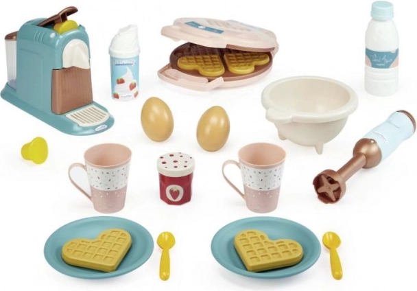 Complete 3-in-1 ontbijtset voor kinderen met een koffiezetapparaat, wafelijzer en staafmixer voor leuk en creatief spelen in het keukentje. Inclusief veel accessoires zoals 4 wafels, 2 kopjes, 2 eieren, 2 capsules voor het koffiezetapparaat, een kom, een fles melk, een slagroomspuitbus en een pot jam. Ideaal voor het stimuleren van de verbeelding en sociale rollenspellen.