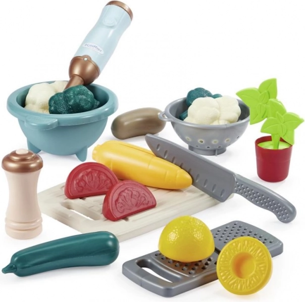 De set bevat een staafmixer van 4 × 4 × 23 cm, een kom, vergiet, snijplank, mes, rasp en realistische nepgroenten. Hoogwaardig kunststof en afgeronde vormen zijn aangepast aan kinderhandjes en veilig voor dagelijks spel.