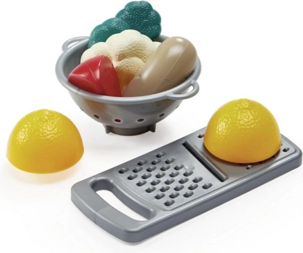Kom, vergiet, snijplank, mes, rasp en nepgroenten laten kinderen snijden, raspen en mixen zoals in een echte keuken.