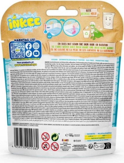 Maak badderen leuker voor kinderen én jezelf met de speelse INKEE bruisballen in de vorm van een flamingo. In de verpakking vind je drie kleurrijke ballen (roze, paars, blauw) met een kauwgomgeur en verzorgende jojoba-olie. De samenstelling is vegan, zonder microplastics, gluten, SLS en paraffine en is ontworpen om het bad niet ongecontroleerd te verkleuren. Perfect voor een leuke, geurige en milde badervaring.