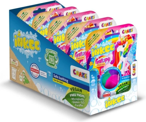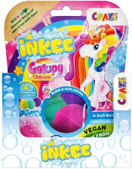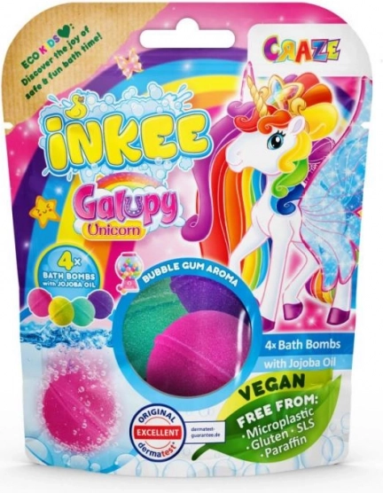 Breng plezier en kleur in het kinderbad met INKEE Galupy Unicorn. Elke bal bruist zachtjes in het water, geeft vrolijke kleuren en een zoete kauwgomgeur af, terwijl jojoba-olie helpt de huid zacht te houden.
