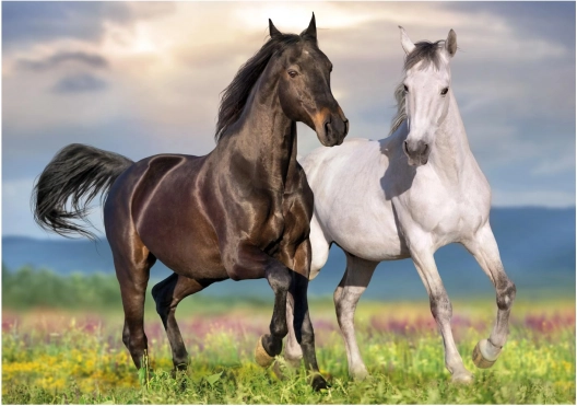 Ontdek het plezier van puzzelen met het indrukwekkende motief van twee paarden in galop. Dit beeld boeit door realistische details en levendige kleuren die na voltooiing schitteren als decoratie. Dankzij de doordachte moeilijkheidsgraad is de puzzel perfect voor zowel beginners als gevorderden.