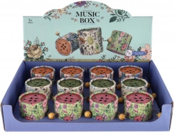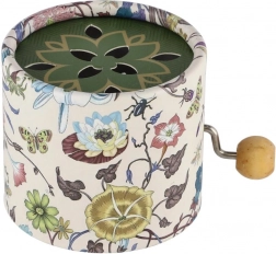 Het doosje is verkrijgbaar in meerdere kleurvarianten met een decoratief bloemenpatroon. De handmatige mechanische aandrijving heeft geen batterijen nodig, waardoor het altijd klaar is voor gebruik. Aanbevolen voor kinderen vanaf 3 jaar.
