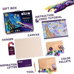 Breng de magie van het schilderij Sterrennacht van Vincent van Gogh in huis en maak je eigen unieke kunstwerk. De set gebruikt air clay (zelfhardende klei), wat het eindresultaat een plastisch 3D-effect geeft. Vingerschilderen is intuïtief, leuk en ontspannend – geschikt voor zowel kinderen als volwassenen.