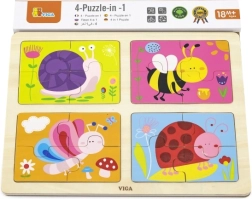 De set bevat vier aparte puzzels met kleurrijke illustraties van diertjes, geschikt voor kinderen. Elk plaatje bestaat uit vier delen, wat in totaal 16 stukken maakt. De puzzels zijn bedoeld voor kinderen vanaf 18 maanden en ondersteunen hun fijne motoriek, logisch denken en creativiteit.