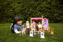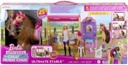 Beleef een ruiterdag met de Barbie Ultimate Stable, die een 360° speelomgeving biedt en tal van accessoires voor paardenverzorging. Kinderen kunnen Barbie helpen met voeren bij het station, wassen en borstelen in de verzorgingszone, springen oefenen over hindernissen en daarna trots linten tentoonstellen aan de trofeewand. Er is ook een roze “plug-and-play”-tuintje en de stal kan eenvoudig worden ingeklapt voor gemakkelijk opbergen.