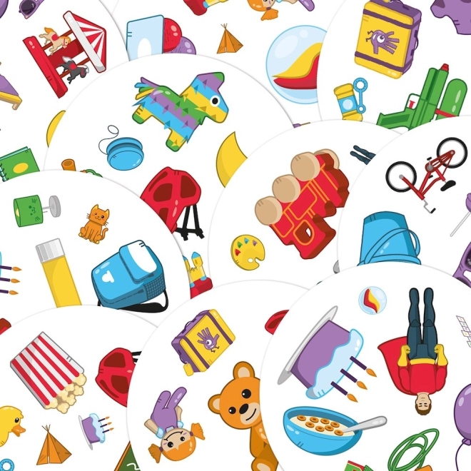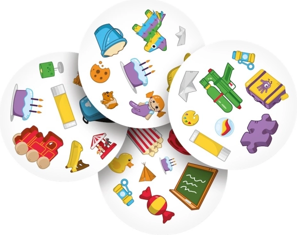 Dobble Kids is een spel dat reactievermogen en snelheid traint, volledig aangepast aan de behoeften van de jongste kinderen. De set bevat 55 kaarten met symbolen die voorwerpen en speelgoed voorstellen waar kinderen elke dag mee spelen. Teddybeer, rugzak, bal, fiets, pop – eenvoudige afbeeldingen die makkelijker te benoemen zijn, zodat we kinderen al vanaf 4 jaar kunnen laten meespelen.