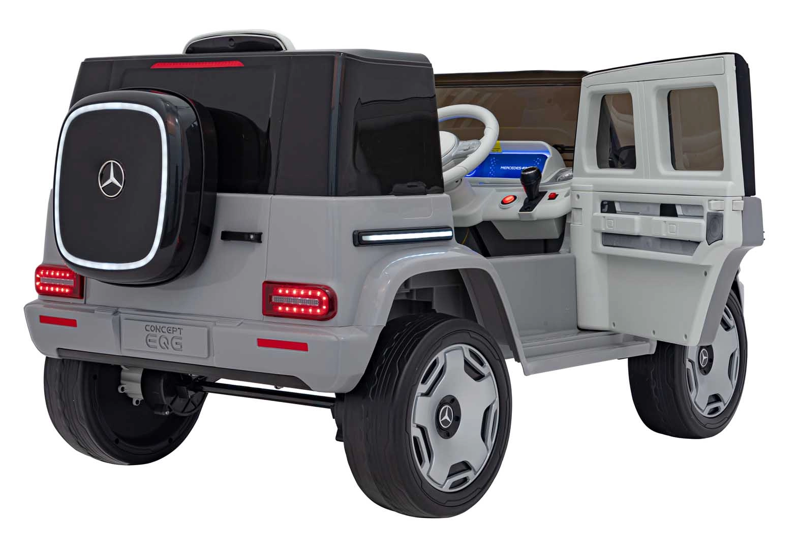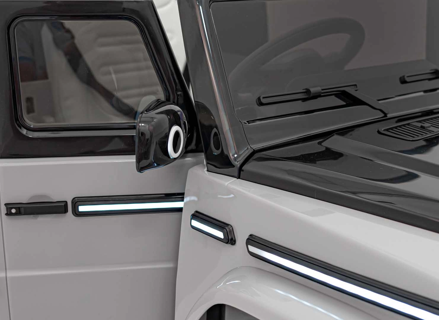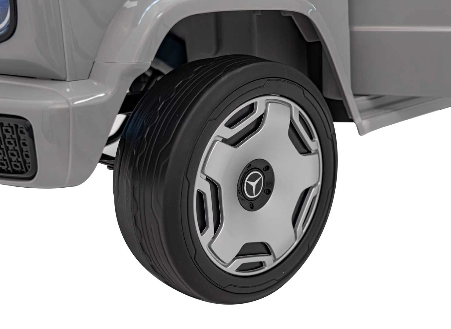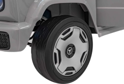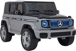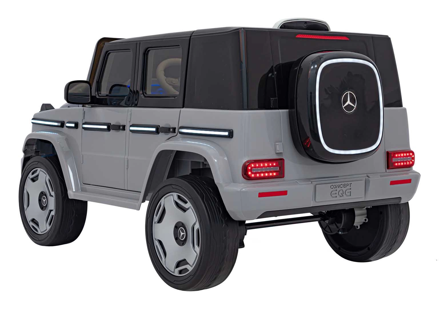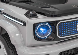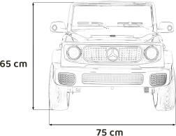 Ontdek de premium elektrische kinderauto geïnspireerd op de Mercedes-Benz EQG. Kinderen zullen blij zijn met de te openen deuren, de LED-verlichting voor en achter, inclusief zijdelingse carrosserieverlichting en het verlichte achterste “reserve” wiel. Zachte EVA-banden en achterwielvering zorgen voor comfort op diverse ondergronden.