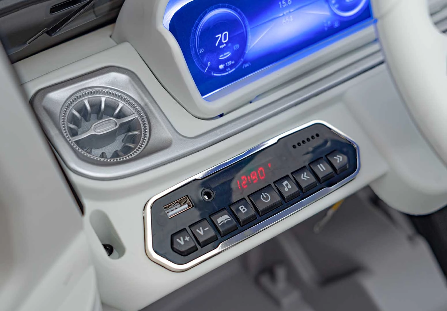 Het geïntegreerde audiopaneel speelt favoriete nummers af via USB, Bluetooth of AUX. Verder aanwezig: ingebouwde melodieën, batterij-indicator en claxon op het stuur. De robuuste constructie met een draagvermogen van 30 kg en een hoge bodemvrijheid van 16 cm staat garant voor langdurig en betrouwbaar plezier.