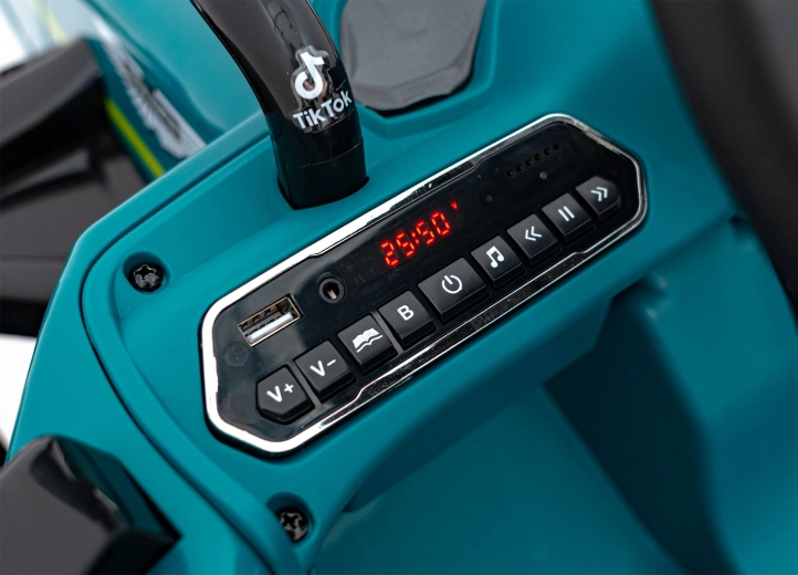 - MP3, ingebouwde melodieën, USB, Bluetooth, AUX (aansluiting telefoon/MP3), stuurknoppen (melodieën en claxon)