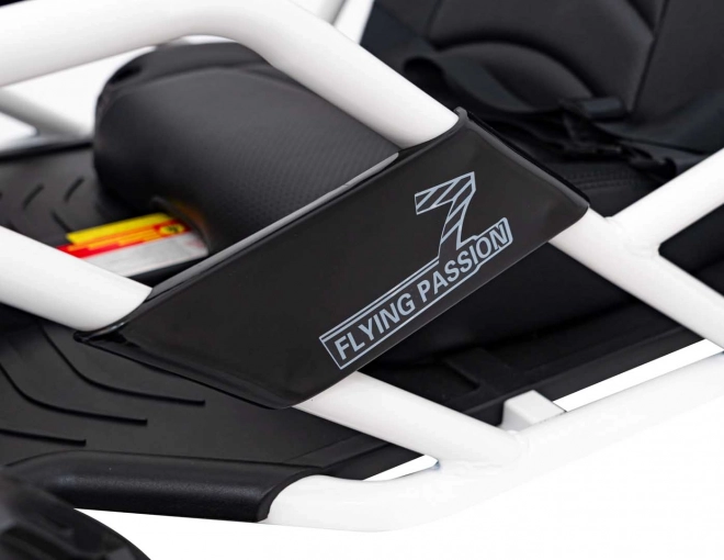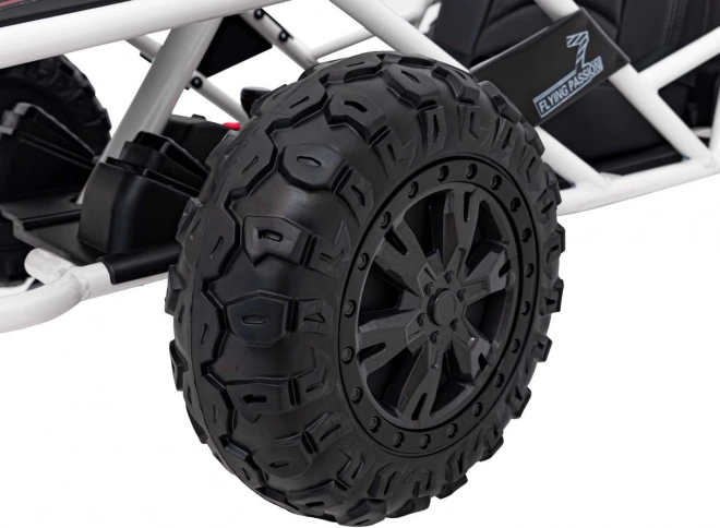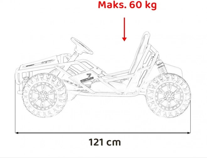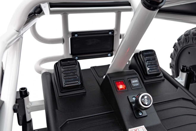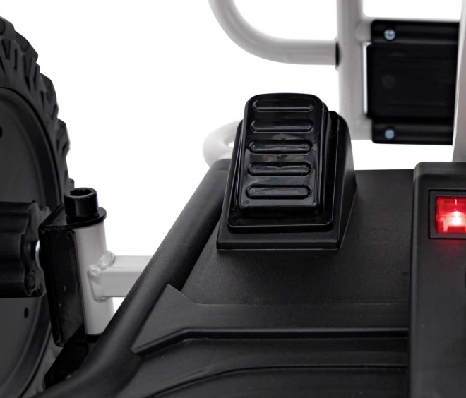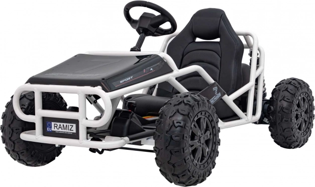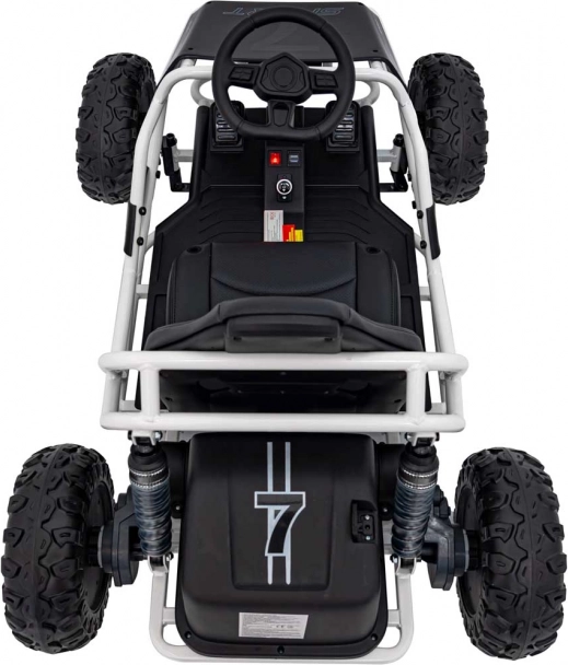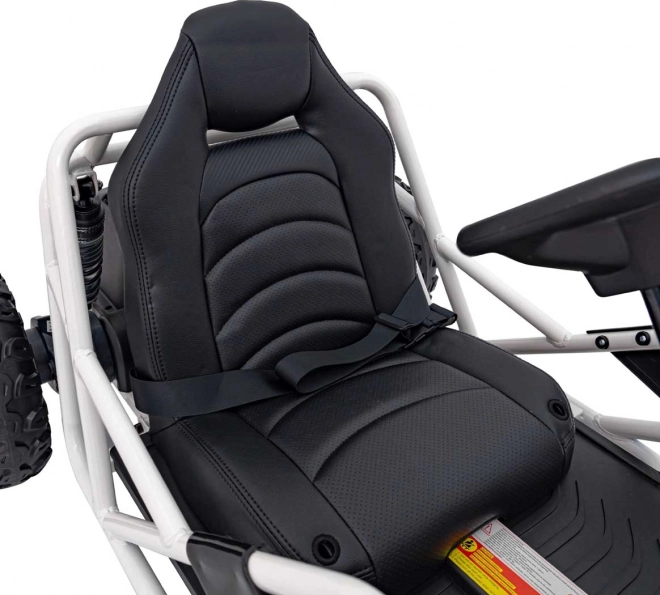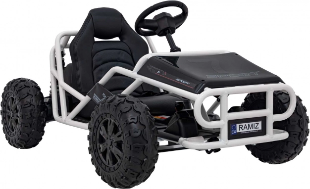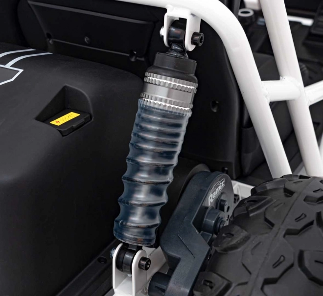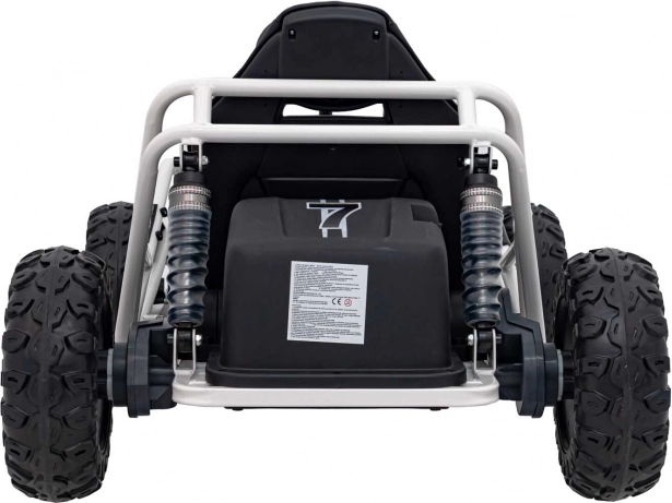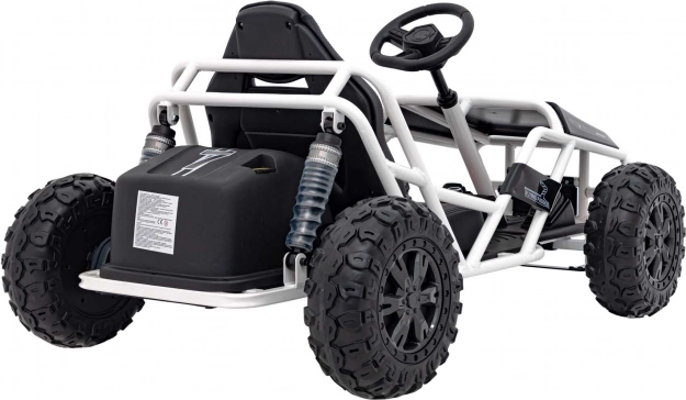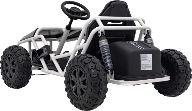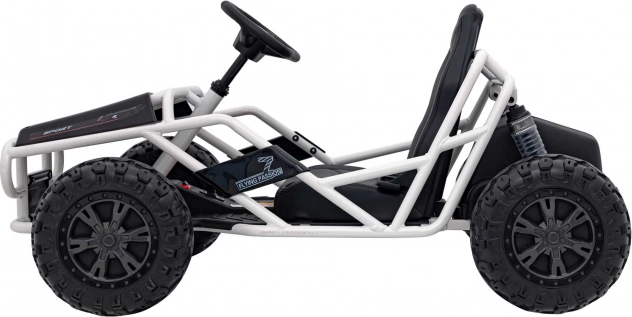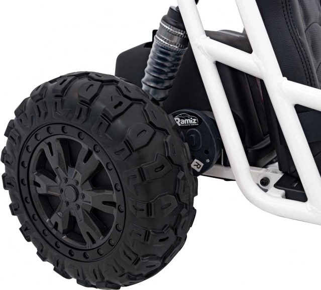 Dankzij de grote EVA-wielen (29×11 cm), de achterste schokdempers en de hoge bodemvrijheid (speling 15 cm) neemt de auto oneffenheden moeiteloos. De ruime eco-leren stoel met veiligheidsgordels verhoogt het comfort en de veiligheid tijdens het rijden.