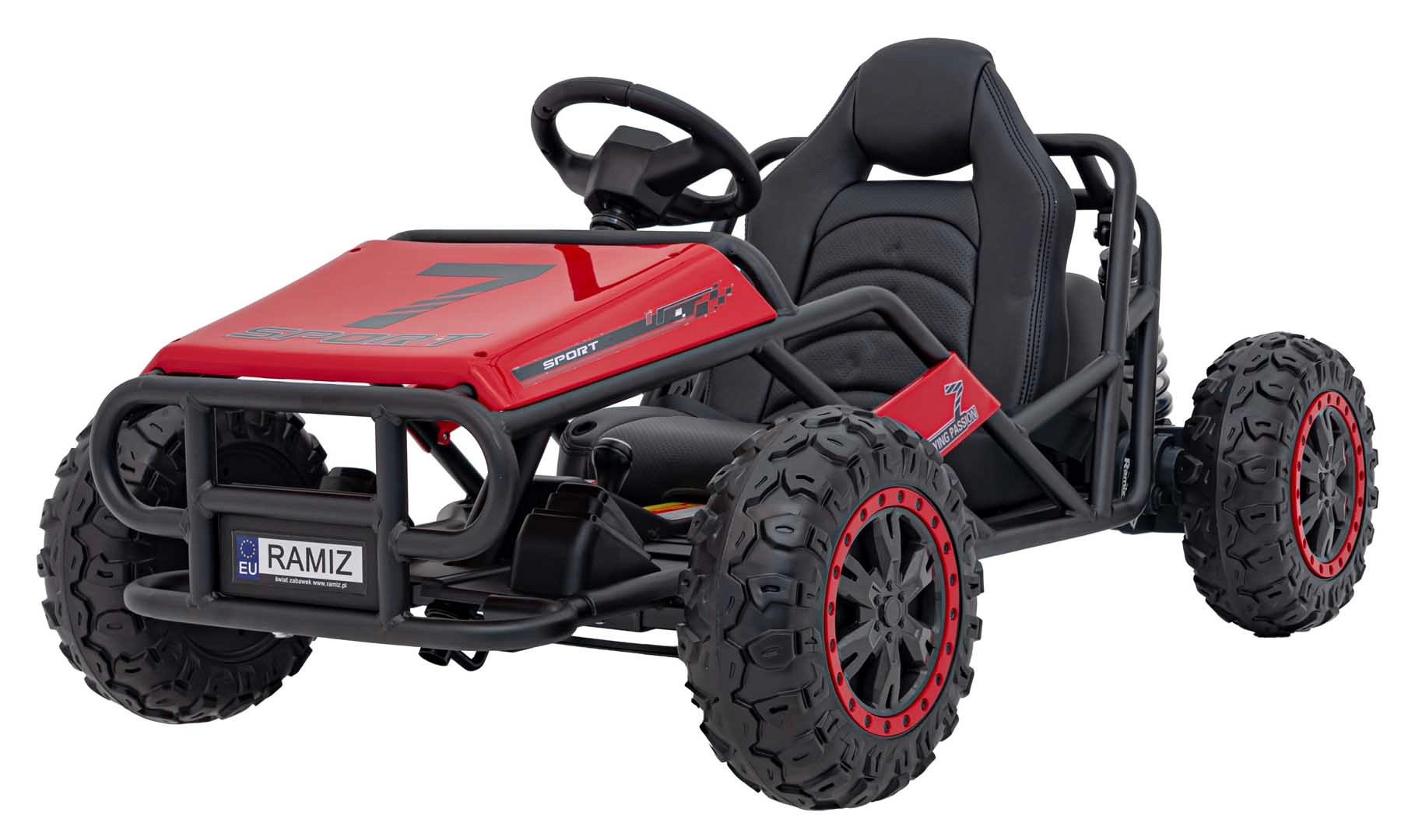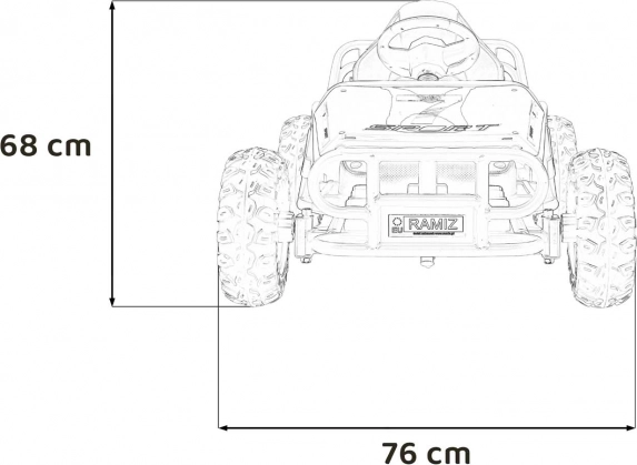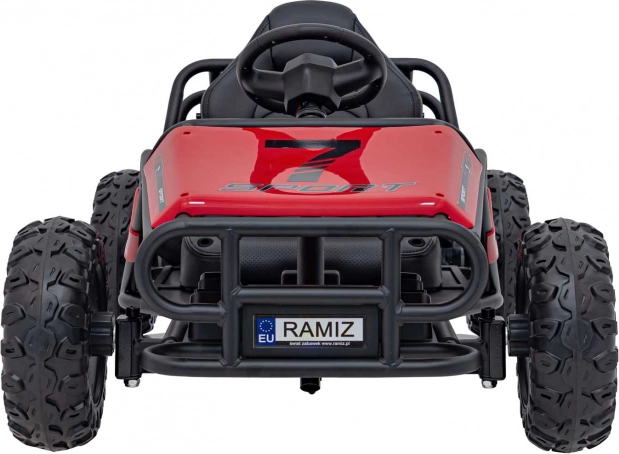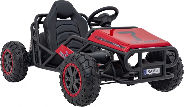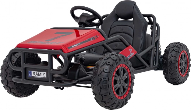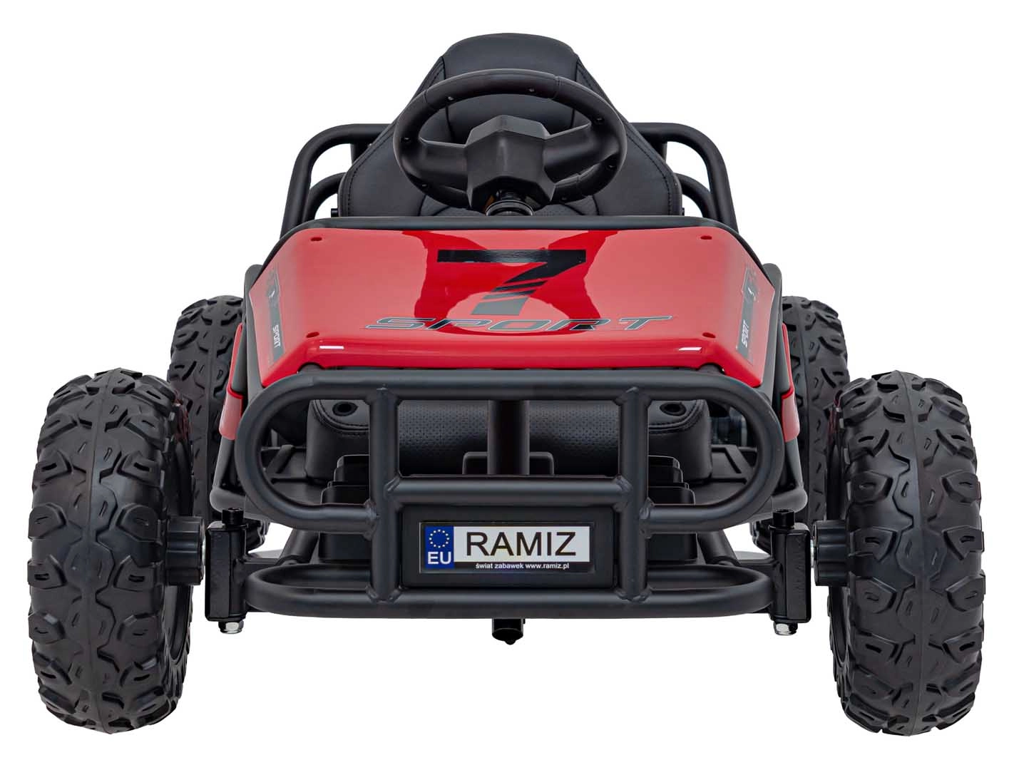 De sportieve kinder skelter RAMIZ is gemaakt voor avonturen in de tuin en op onverharde paden. Twee krachtige motoren 2×100 W, gevoed door een 24V 10Ah accu, bieden betrouwbare trekkracht, een soepele start en de keuze uit twee snelheden. Grote EVA-wielen 29×11 cm dempen oneffenheden uitstekend, de dubbele achterste schokdempers voegen stabiliteit toe en een bodemvrijheid van 15 cm maakt het soepel nemen van obstakels mogelijk.