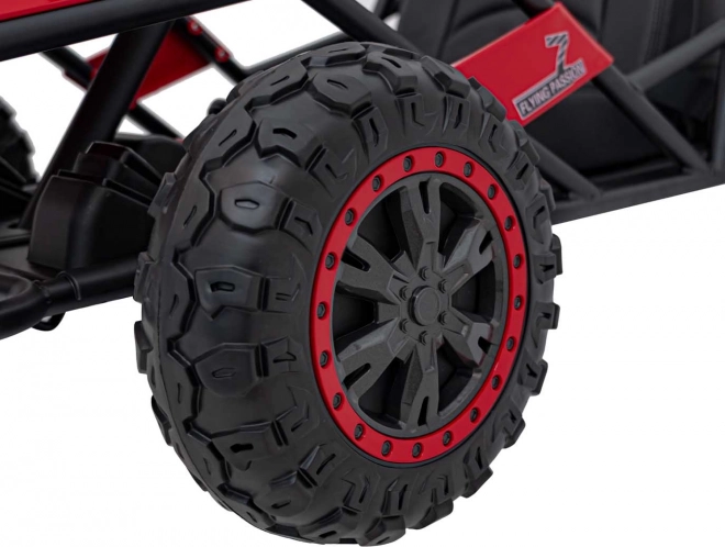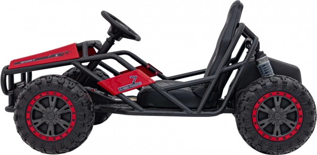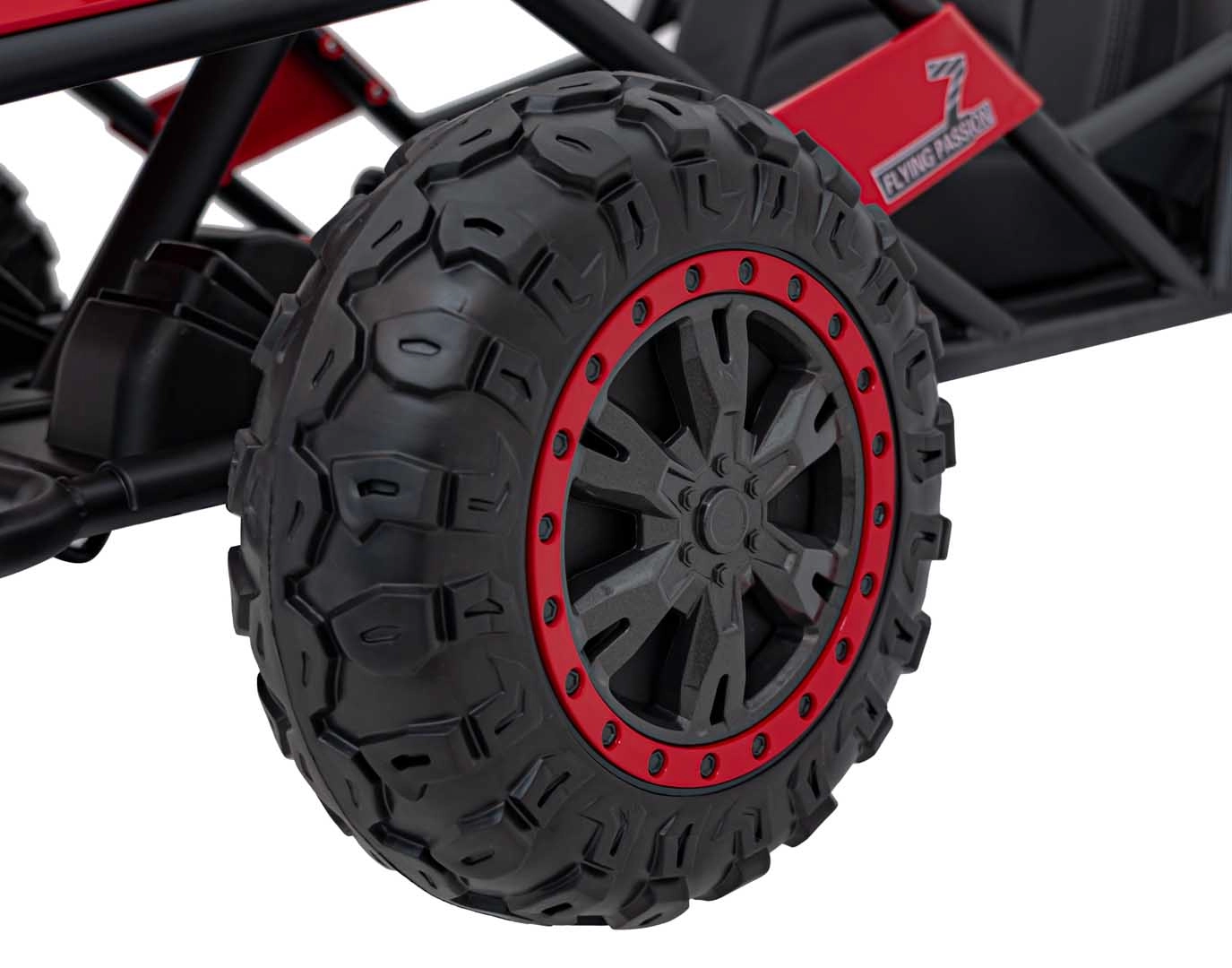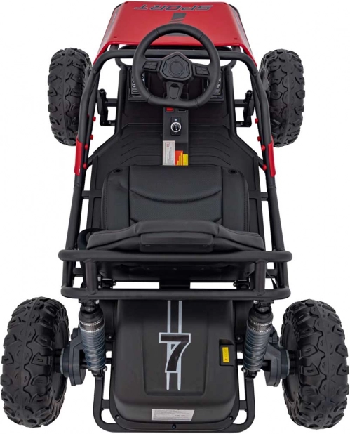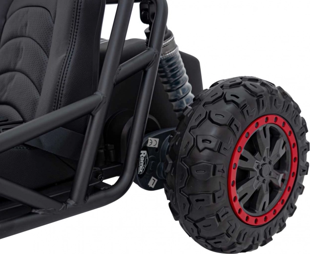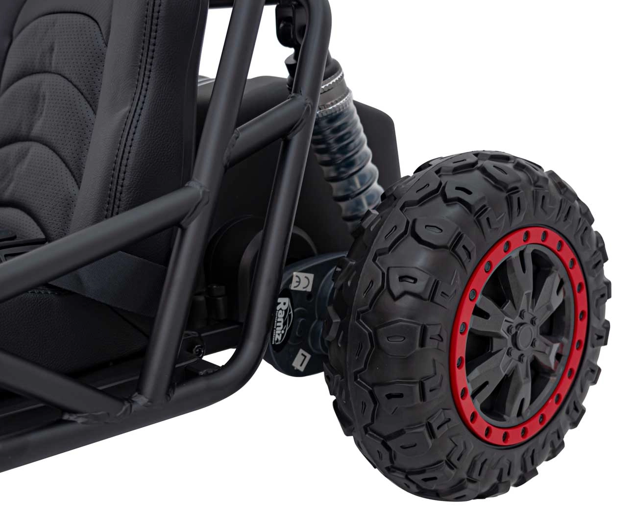 De sportieve kinder skelter RAMIZ is gemaakt voor avonturen in de tuin en op onverharde paden. Twee krachtige motoren 2×100 W, gevoed door een 24V 10Ah accu, bieden betrouwbare trekkracht, een soepele start en de keuze uit twee snelheden. Grote EVA-wielen 29×11 cm dempen oneffenheden uitstekend, de dubbele achterste schokdempers voegen stabiliteit toe en een bodemvrijheid van 15 cm maakt het soepel nemen van obstakels mogelijk.