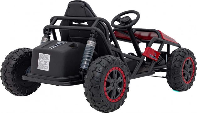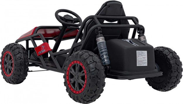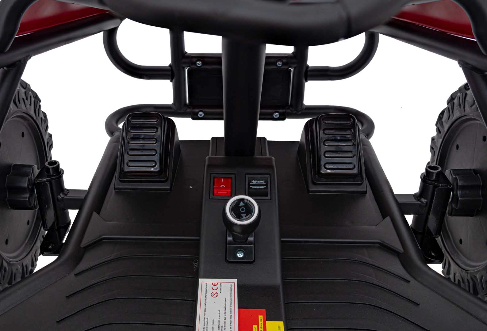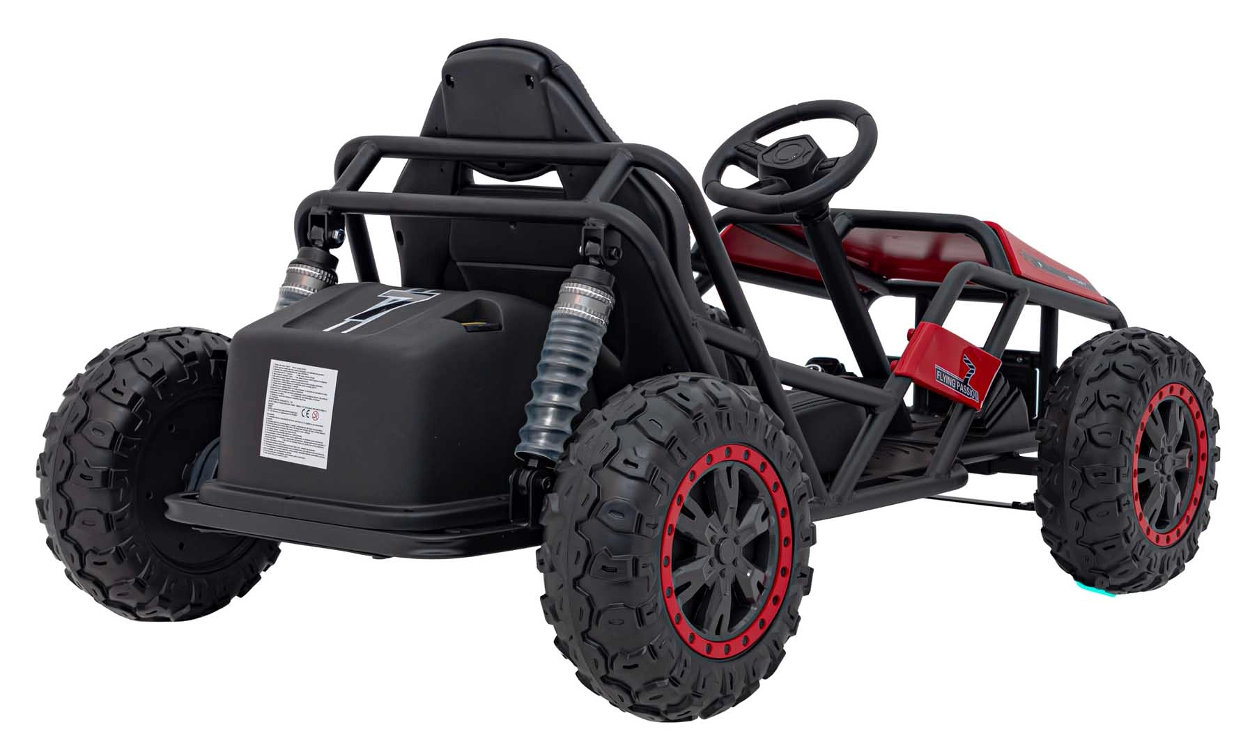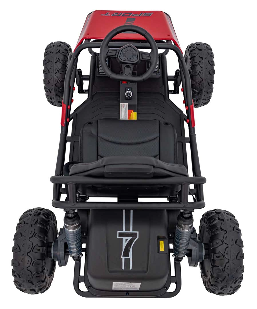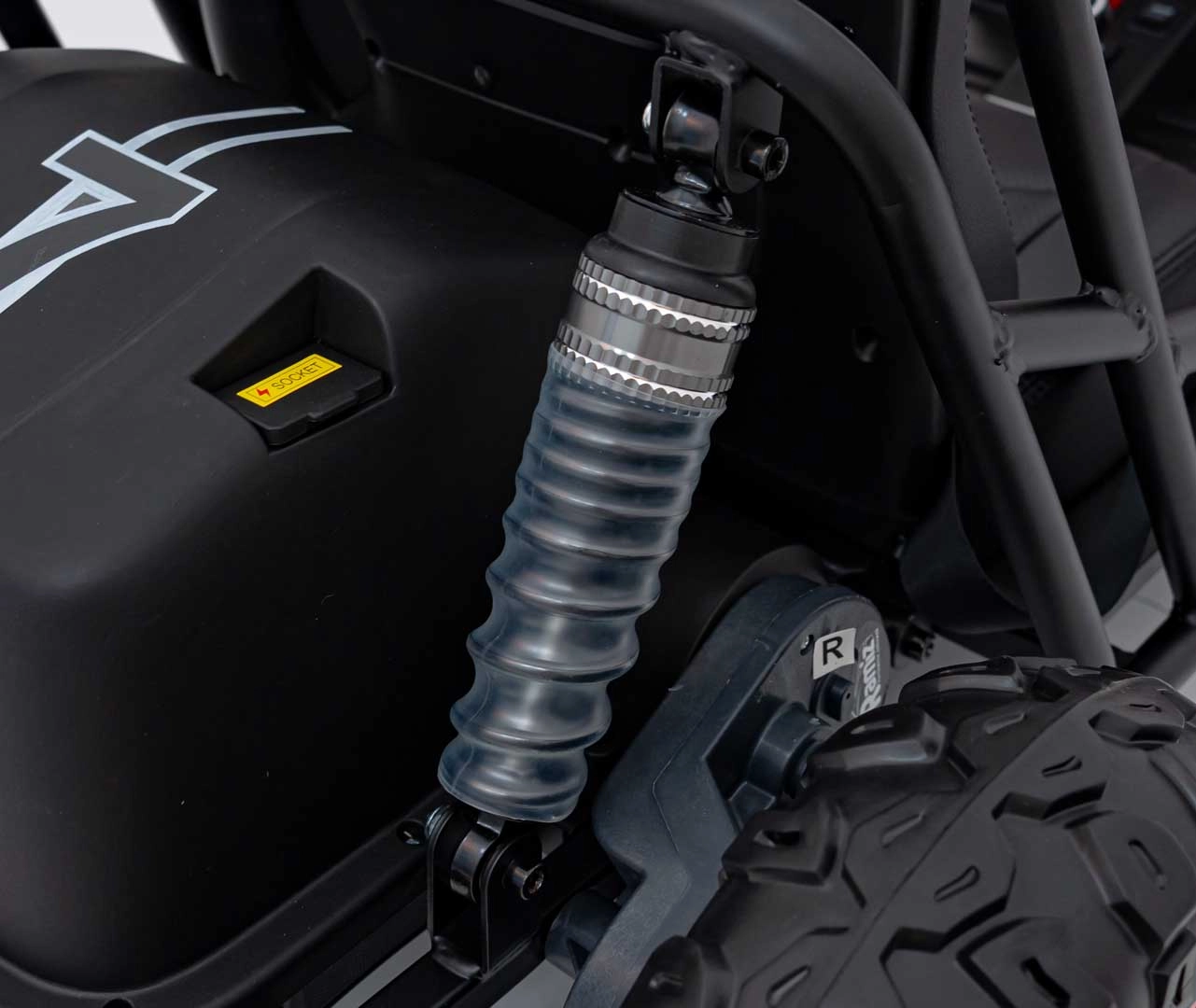 Robuuste kinder skelter met 2x100 W aandrijving en een 24V 10Ah accu biedt soepele start, twee snelheden en rijden vooruit/achteruit. Grote EVA-wielen 29×11 cm, achter dubbele schokdempers en bodemvrijheid 15 cm zorgen voor stabiliteit in het terrein. Het comfort wordt verhoogd door een zitbreedte van 38 cm, eco-leer en veiligheidsgordels. Het maximale draagvermogen is 60 kg.