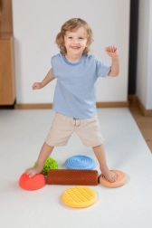 Dit sensorische parcours in zachte pasteltinten is perfect voor spel, therapie en oefening. Tijdens het lopen over de afzonderlijke stenen en de rol trainen kinderen hun balans, grove motoriek en ruimtelijke oriëntatie. De verschillende oppervlakken met nopjes bieden intensieve tactiele feedback, helpen de voeten te activeren en verbeteren de stabiliteit.