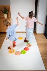 Kinderen ontwikkelen stabiliteit en coördinatie terwijl ze van steen naar steen stappen. De variabele opstelling van de elementen maakt het mogelijk de moeilijkheidsgraad aan te passen.