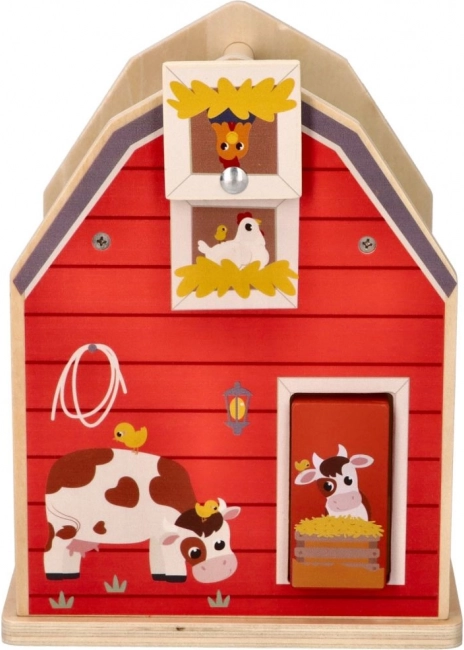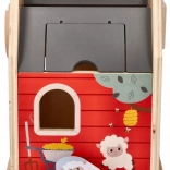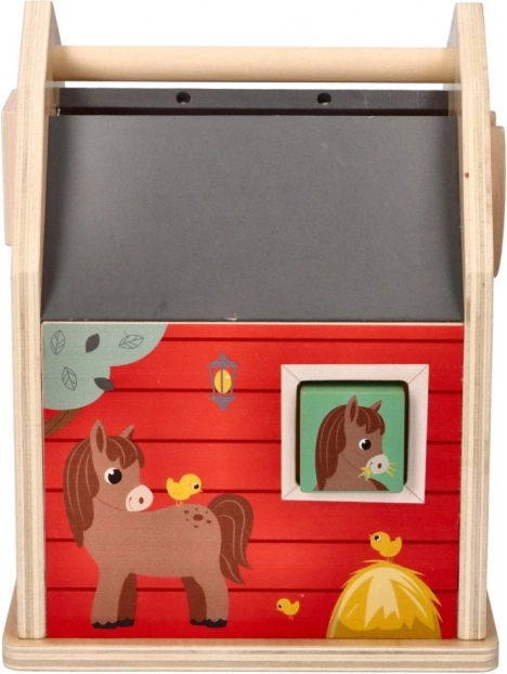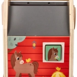 Kleurig, dubbelzijdig huisje in de vorm van een stal met schattige illustraties, ontworpen als draagbaar speelgoed.