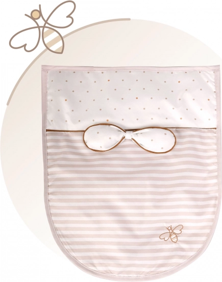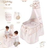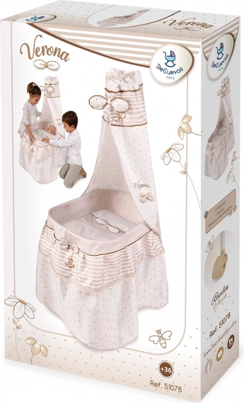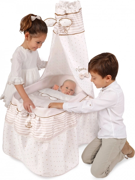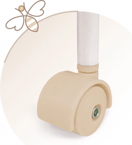 Deze stijlvolle poppenwieg is afgestemd op zachte pasteltinten beige en wit met subtiele stippen en strepen. De natuurlijke uitstraling wordt aangevuld met strikjes die aan bloemblaadjes doen denken en kleine bijenborduursels die de charme van de hele VERONA-collectie benadrukken. Dankzij de zwenkwielen kan de wieg gemakkelijk van kamer naar kamer worden verplaatst, zodat de kleine verzorger haar baby altijd dicht bij zich heeft.