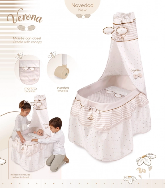 Elegante mobiele poppenwieg uit de VERONA-collectie met een zacht, natuurlijk design, hemel met strikjes, een comfortabele dekbedset en 4 zwenkwielen voor eenvoudig manoeuvreren. Nauwkeurige afwerking, lichte bediening en veilige materialen zullen elke kleine poppenmama blij maken.