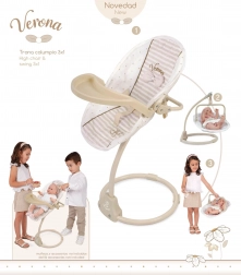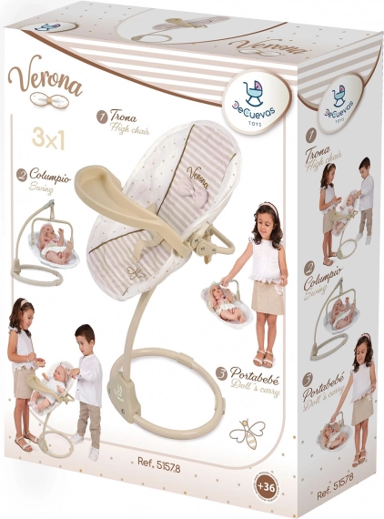 Elegante en praktische 3-in-1 set voor poppen uit de Verona-collectie, die een kinderstoel, schommel en draagzitje in één combineert. Dankzij de afneembare, omkeerbare zitting met veiligheidsriemen en het kunststof blad is spelen eenvoudig en veilig. Het moderne design in zachte natuurlijke kleuren, de hoogwaardige afwerking en de eenvoudige bediening zullen elk kind vanaf 3 jaar bekoren.