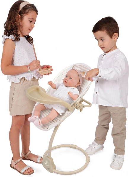 Deze multifunctionele 3-in-1 stoel en schommel voor poppen uit de Verona-collectie biedt kinderen realistisch speelplezier en tal van mogelijkheden om voor hun favoriete babypop te zorgen. De combinatie van lichtbeige en wit met stippen- of streepjespatroon, afgewerkt met subtiele biezen en strikapplicaties, creëert een tijdloze natuurlijke look geïnspireerd op Spaans design.