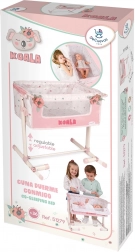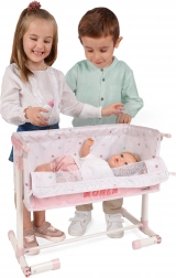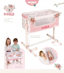 Schattig newborn-poppenbedje uit de KOALA-serie met cosleep-functie, zodat de pop veilig en comfortabel direct naast de “mama” kan liggen. Voorzien van een neerklapbare zijwand met net voor beter toezicht, in hoogte verstelbaar in 3 standen en verstelbare poten om eenvoudig tegen het bed aan te schuiven. Licht, stabiel en met een subtiel bloemendesign in roze-wit.