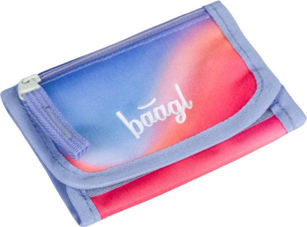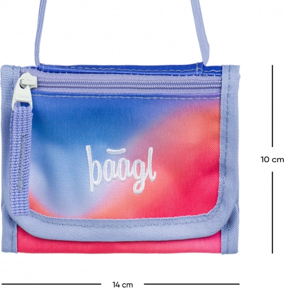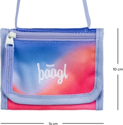 Praktische en stijlvolle Baagl-nekportemonnee in rood regenboogdesign, ideaal voor kinderen en tieners. Biedt een sterk en duurzaam materiaal, een praktisch koord om om de nek te dragen en een veilige klittenbandsluiting, aangevuld met een klein ritsvakje voor kleingeld.