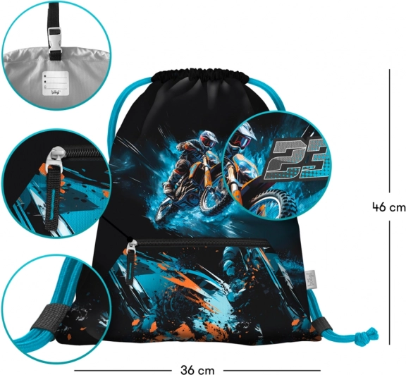 Praktische sportzak BAAGL met een motorcrossmotief, ideaal voor schoenen en vrijetijdsactiviteiten. Biedt een duurzaam, afwasbaar materiaal, een voorvak met rits voor kleinigheden en stevige trekkoorden voor comfortabel dragen op de rug. Dankzij de karabijnhaak bevestig je hem eenvoudig aan een schooltas of rugzak.