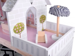 Het huisje is uitgerust met een LED-strip voor aangenaam ambient licht in elke kamer. De open constructie, ramen en gedecoreerde gevel met bloemen en lampen geven een realistische uitstraling. In de verpakking zit een brede selectie houten meubels: van eettafel, fauteuils en bank, via badkameruitrusting, tot een zwarte piano met krukje en een ligstoel met parasol voor op het terras.