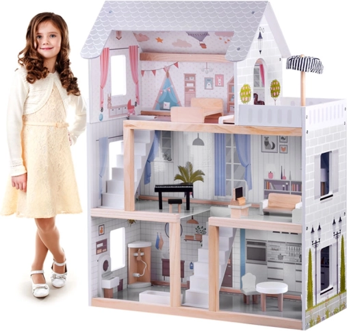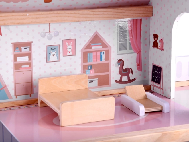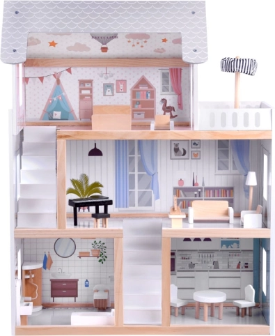 Dit houten poppenhuis is ontworpen om kinderen te inspireren tot creatief spel en verhalen vertellen. Het biedt een begane grond met keuken en badkamer, een eerste verdieping met woonkamer en leeshoek met muzieknis, en een zolder met een schattige kinderkamer en een groot terras. De subtiele boho-esthetiek, illustraties en houten details zorgen voor een kalmerende uitstraling.